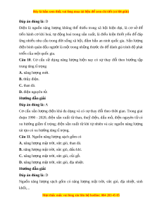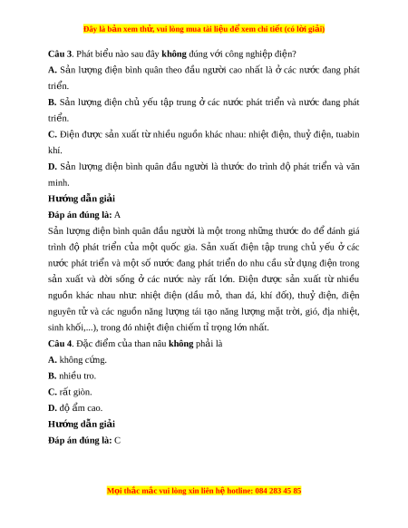 ớ đo trình độ phát tri n ể và văn minh. Hư ng d ớ ẫn gi i ả Đáp án đúng là: A S n ả lư ng ợ đi n ệ bình quân đ u ầ ngư i ờ là m t ộ trong nh ng ữ thư c ớ đo để đánh giá trình độ phát tri n ể c a ủ m t ộ qu c ố gia. S n ả xu t ấ đi n ệ t p ậ trung chủ y u ế ở các nư c ớ phát tri n ể và m t ộ số nư c ớ đang phát tri n ể do nhu c u ầ sử d ng ụ đi n ệ trong s n ả xu t ấ và đ i ờ s ng ố ở các nư c ớ này r t ấ l n. ớ Đi n ệ đư c ợ s n ả xu t ấ từ nhi u ề nguồn khác nhau nh : ư nhi t ệ đi n ệ (d u ầ m , ỏ than đá, khí đ t ố ), thuỷ đi n, ệ đi n ệ nguyên tử và các ngu n ồ năng lư ng ợ tái t o ạ năng lư ng ợ m t ặ tr i ờ , gió, đ a ị nhi t ệ ,