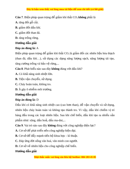 C. Cháy hoàn toàn, không tro. D. Ít gây ô nhi m ễ môi trư ng. ờ Hư ng d ớ ẫn gi i ả Đáp án đúng là: D