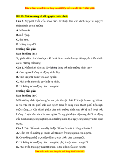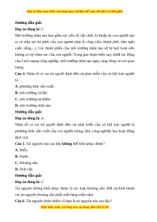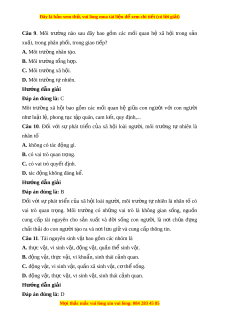 Đây là bản xem th , vu ử i lòng mua tài li u ệ đ xe ể m chi ti t (c ế ó l i ờ gi i ả ) Câu 9. Môi trư ng ờ nào sau đây bao g m ồ các m i ố quan hệ xã h i ộ trong s n ả xuất, trong phân ph i ố , trong giao ti p? ế A. Môi trư ng ờ nhân t o. ạ B. Môi trư ng t ờ ổng h p. ợ C. Môi trư ng ờ xã h i ộ . D. Môi trư ng ờ t nhi ự ên. Hư ng d ớ ẫn gi i ả Đáp án đúng là: C Môi trư ng ờ xã h i ộ bao g m ồ các m i ố quan hệ gi a ữ con ngư i ờ v i ớ con ngư i ờ nh l ư u t ậ l , phong t ệ c t ụ p quán, cam ậ k t ế , quy đ nh,... ị Câu 10. Đối v i ớ sự phát tri n ể c a ủ xã h i ộ loài ngư i ờ , môi trư ng ờ tự nhiên là nhân tố
