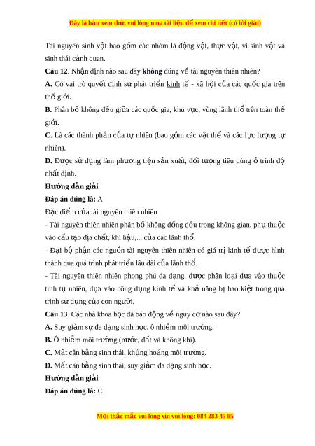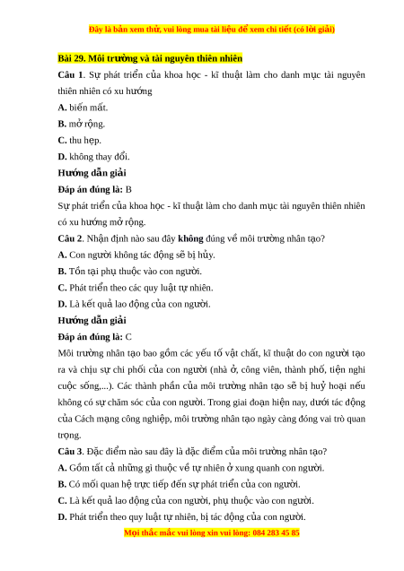 Câu 1. Sự phát tri n ể c a ủ khoa h c ọ - kĩ thu t ậ làm cho danh m c ụ tài nguyên thiên nhiên có xu hư ng ớ A. bi n m ế t ấ . B. m r ở ng. ộ C. thu hẹp. D. không thay đ i ổ . Hư ng ớ d n gi ẫ i ả Đáp án đúng là: B Sự phát tri n ể c a ủ khoa h c ọ - kĩ thu t ậ làm cho danh m c ụ tài nguyên thiên nhiên có xu hư ng m ớ ở r ng. ộ Câu 2. Nh n đ ậ