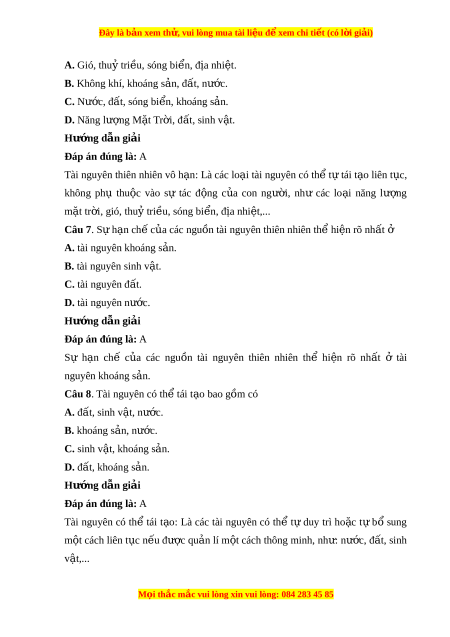 Câu 8. Tài nguyên có th t ể ái t o ạ bao gồm có A. đ t ấ , sinh v t ậ , nư c. ớ B. khoáng s n, n ả ước. C. sinh v t ậ , khoáng s n. ả D. đ t ấ , khoáng s n. ả Hư ng ớ d n gi ẫ i ả Đáp án đúng là: A