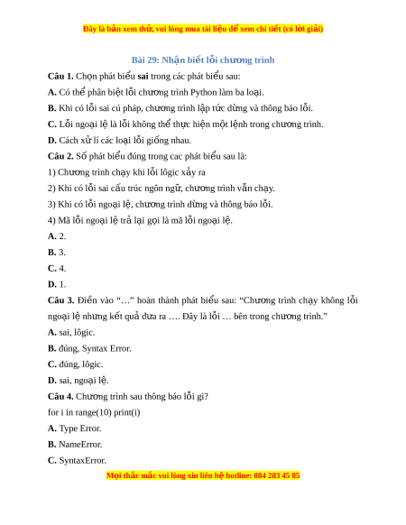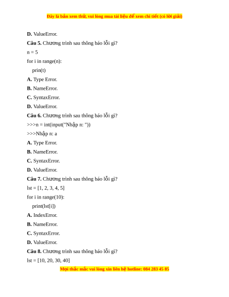 Đây là bản xem th , vu ử i lòng mua tài li u ệ đ xe ể m chi ti t (c ế ó l i ờ gi i ả ) print(lst[6]) A. NameError. B. SyntaxError. C. ValueError. D. IndexError. Câu 9. Chư ng t ơ rình sau m c ắ lỗi gì? #Tính tích c a 3 s ủ ố nguyên dư ng đ ơ u t ầ iên. >>>s = 1 >> for i in range(3) >>>s = s * i >>>print(s) 0 A. Lôgic. B. Sai cú pháp. C. L i ỗ ngo i ạ l . ệ D. Không có lỗi. Câu 10. Mã l i ỗ ngo i ạ l c ệ a l ủ nh s ệ au là float(“2 + 3”) A. IndexError. B. TypeError. C. ValueError. D. SyntaxError. Câu 11. Mã l i ỗ nào đư c đ ợ a ư ra khi l nh t ệ h c hi ự n phép chi ệ a cho giá tr 0 ị A. ZeroDivisionError. B. TypeError. C. ValueError. D. SyntaxError. M i