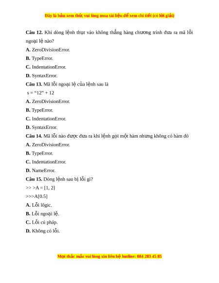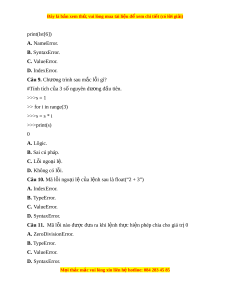 Đây là bản xem th , vu ử i lòng mua tài li u ệ đ xe ể m chi ti t (c ế ó l i ờ gi i ả ) Câu 12. Khi dòng l nh ệ th t ụ vào không th ng ẳ hàng chư ng ơ trình đ a ư ra mã l i ỗ ngo i ạ l nào? ệ A. ZeroDivisionError. B. TypeError. C. IndentationError. D. SyntaxError. Câu 13. Mã l i ỗ ngo i ạ l c ệ a l ủ nh s ệ au là s = “12” + 12 A. ZeroDivisionError. B. TypeError. C. IndentationError. D. SyntaxError. Câu 14. Mã l i ỗ nào đư c đ ợ a ư ra khi l nh g ệ i ọ m t ộ hàm nh ng không có ư hàm đó A. ZeroDivisionError. B. TypeError. C. IndentationError. D. NameError. Câu 15. Dòng l nh s ệ au b l ị i ỗ gì? >> >A = [1, 2] >>>A[0.5] A. L i ỗ lôgic. B. Lỗi ngo i ạ l . ệ C. L i ỗ cú pháp. D. Không có lỗi. M i