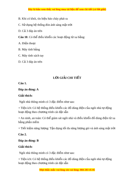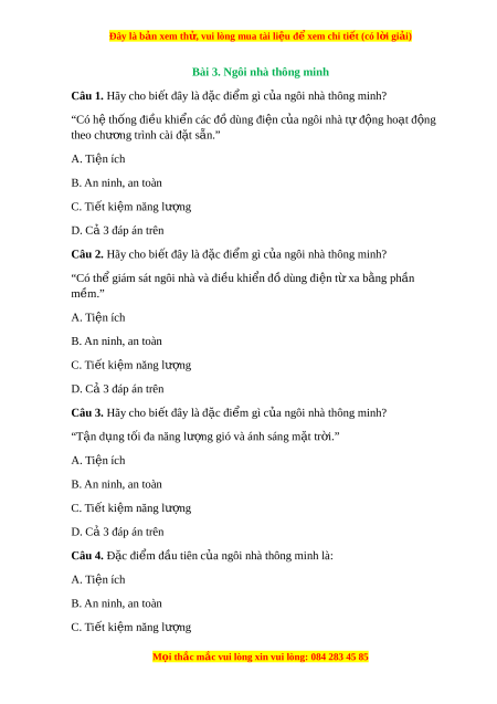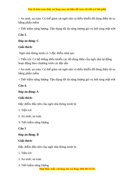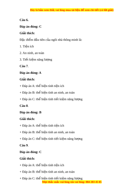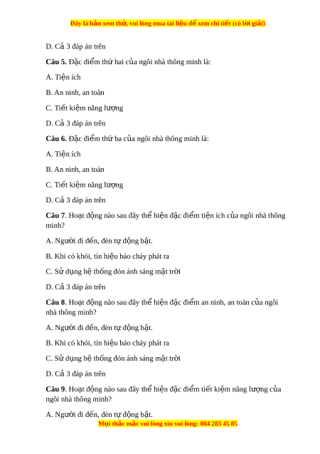 Đây là bản xem th , vu ử i lòng mua tài li u ệ đ xe ể m chi ti t ế (có l i ờ gi i ả ) D. Cả 3 đáp án trên Câu 5. Đ c ặ đi m ể thứ hai c a ngôi ủ nhà thông minh là: A. Tiện ích B. An ninh, an toàn C. Ti t ế ki m ệ năng lư ng ợ D. Cả 3 đáp án trên Câu 6. Đ c ặ đi m ể thứ ba c a ngôi ủ nhà thông minh là: A. Tiện ích B. An ninh, an toàn C. Ti t ế ki m ệ năng lư ng ợ D. Cả 3 đáp án trên Câu 7. Ho t ạ đ ng