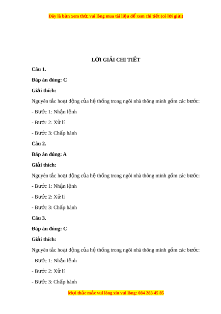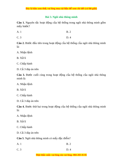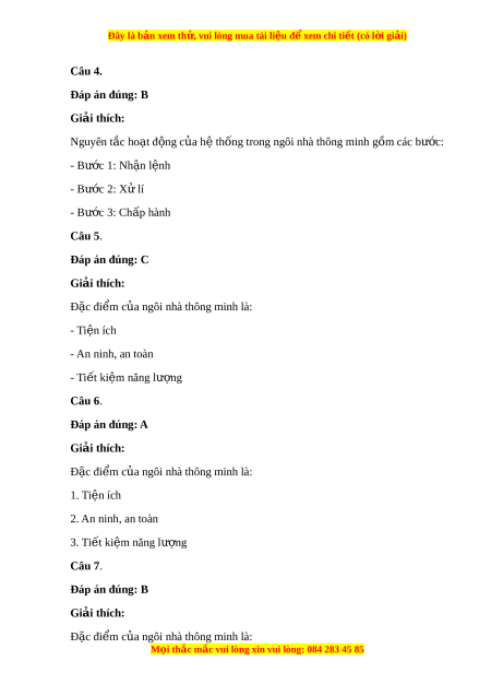 rong ngôi nhà thông minh gồm các bư c: ớ - Bư c 1: ớ Nh n ậ l nh ệ - Bư c 2: ớ Xử lí - Bư c 3: ớ Chấp hành Câu 5. Đáp án đúng: C Giải thích: Đ c ặ đi m ể c a ngôi ủ nhà thông minh là: - Tiện ích - An ninh, an toàn - Ti t ế kiệm năng lư ng ợ Câu 6. Đáp án đúng: A Giải thích: Đ c ặ đi m ể c a ngôi ủ nhà thông minh là: 1. Tiện ích 2. An ninh, an toàn 3. Ti t ế kiệm năng lư ng ợ Câu 7. Đáp án đúng: B Giải thích: Đ c ặ đi m ể c a ngôi ủ nhà thông minh là: M i