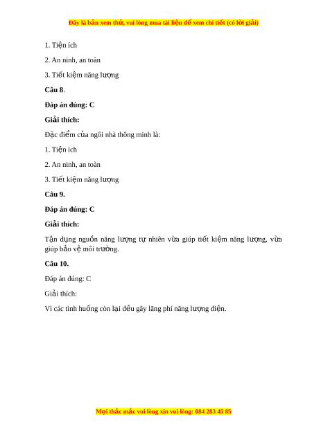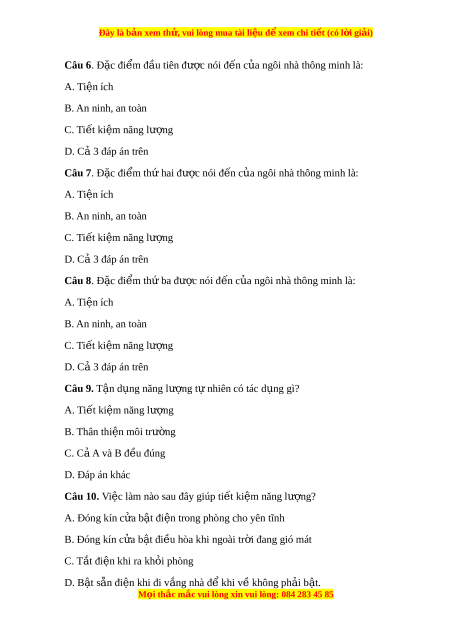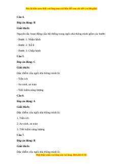 Đây là bản xem th , vu ử i lòng mua tài li u ệ đ xe ể m chi ti t ế (có l i ờ gi i ả ) Câu 6. Đ c ặ đi m ể đ u t ầ iên đư c ợ nói đ n c ế a ngôi ủ nhà thông minh là: A. Tiện ích B. An ninh, an toàn C. Ti t ế ki m ệ năng lư ng ợ D. Cả 3 đáp án trên Câu 7. Đ c ặ đi m ể thứ hai đư c nói ợ đ n c ế a