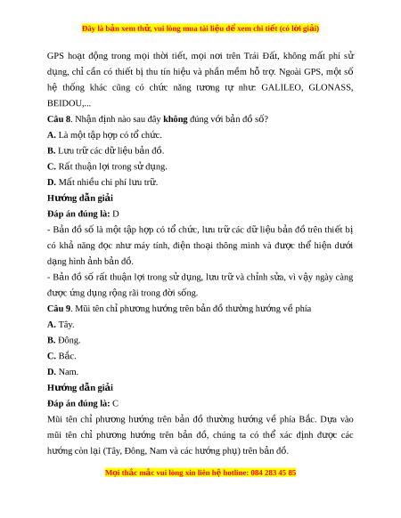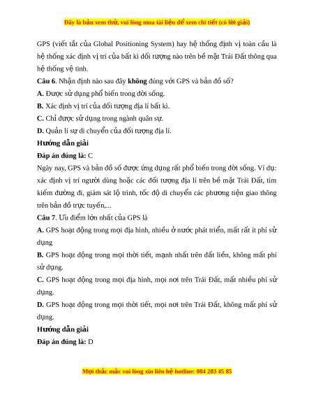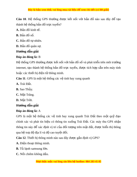 Đây là bản xem th , vu ử i lòng mua tài li u ệ đ xe ể m chi ti t (c ế ó l i ờ gi i ả ) GPS ho t ạ đ ng ộ trong m i ọ th i ờ ti t ế , m i ọ n i ơ trên Trái Đ t ấ , không m t ấ phí sử d ng, ụ chỉ c n ầ có thi t ế bị thu tín hi u ệ và ph n ầ m m ề hỗ tr . ợ Ngoài GPS, m t ộ số hệ th ng ố khác cũng có ch c ứ năng tư ng ơ tự nh : ư GALILEO, GLONASS, BEIDOU,... Câu 8. Nh n ậ đ nh nào s ị