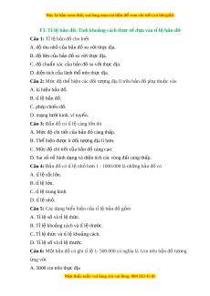 ồ Tính kho ng cách t ả h c t ự d ế a vào t ự l ỉ b ệ n đ ả ồ Câu 1: Tỉ lệ b n ả đồ cho bi t ế A. đ t ộ hu nh c ỏ a ủ b n đ ả ồ so v i ớ th c ự đ a. ị B. độ l n c ớ a b ủ n ả đồ so v i ớ th c đ ự a. ị C. độ chuẩn xác c a b ủ n ả đ s ồ o v i ớ th c đ ự a. ị D. diện tích c a l ủ ãnh th t ổ rên th c ự đ a. ị Câu 2: Mức đ t ộ h hi ể n các ệ đối tư ng ợ đ a ị lí trên b n ả đ ph ồ t ụ hu c ộ vào A. kí hi u b ệ n ả đ . ồ B. tỉ lệ b n đ ả ồ. C. phép chi u ế đồ. D. m ng l ạ ư i ớ kinh, vĩ tuy n. ế Câu 3: B n đ ả ồ có tỉ l càng ệ l n t ớ hì A. M c ứ đ chi ộ ti t ế c a b ủ n ả đ càng t ồ h p. ấ B. Th hi ể n đ ệ ư c í ợ t đ i ố tư ng đ ợ a l ị í h n. ơ C. Mức đ chi ộ ti t ế c a ủ b n đ ả càng cao. ồ D. Sai số v hì ề nh d ng và ạ di n t ệ ích các vùng đ t ấ càng th p. ấ Câu 4: B n đ ả ồ có tỉ l nh ệ ỏ h n 1 : ơ 1000.000 là nh ng b ữ n ả đ có ồ A. tỉ lệ r t ấ l n. ớ B. tỉ lệ l n. ớ C. tỉ lệ trung bình. D. tỉ lệ nh . ỏ Câu 5: Các d ng ạ bi u ể hi n c ệ a ủ t l ỉ b ệ n ả đ g ồ m ồ A. Tỉ lệ số và tỉ l t ệ h c. ứ B. Tỉ lệ kho ng ả cách và tỉ l t ệ hư c. ớ C. Tỉ lệ th c ứ và tỉ l kho ệ ng ả cách. D. Tỉ lệ số và tỉ l t ệ hước. Câu 6: M t ộ b n đ ả ồ có ghi tỉ l 1: