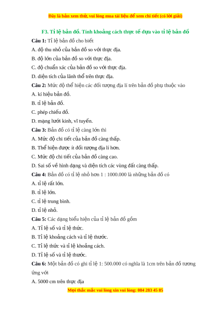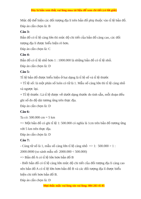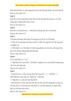 Đây là bản xem th , vu ử i lòng mua tài li u ệ đ xe ể m chi ti t ế (có l i ờ gi i ả ) M c ứ đ t ộ h hi ể n các đ ệ ối tư ng đ ợ a l ị í trên b n đ ả ph ồ t ụ hu c vào t ộ l ỉ b ệ n đ ả . ồ Đáp án cần ch n ọ là: B Câu 3: B n ả đồ có t l ỉ càng l ệ n t ớ hì m c ứ đ chi ộ ti t ế c a b ủ n ả đ càng ồ cao, các đ i ố tư ng đ ợ ịa lí đư c bi ợ u ể hi n r ệ õ h n. ơ Đáp án cần ch n ọ là: C Câu 4: B n ả đồ có t l ỉ nh ệ h ỏ n 1 : ơ 1000.000 là nh ng ữ b n đ ả có t ồ l ỉ nh ệ . ỏ Đáp án cần ch n ọ là: D Câu 5: Tỉ lệ b n đ ả ồ đư c ợ bi u ể hi n ệ ở hai d ng l ạ à t l ỉ s ệ và t ố l ỉ t ệ hư c ớ + T l ỉ s ệ ố: là m t ộ phân s l ố uôn có t l ử à 1. M u s ẫ càng ố l n t ớ hì t l ỉ càng ệ nh ỏ và ngư c ợ l i ạ . + T l ỉ t ệ hư c: ớ Là t l ỉ đ ệ ư c v ợ d ẽ ư i ớ d ng ạ thư c đo t ớ ính s n, m ẵ i ỗ đo n đ ạ u ề ghi số đo đ dài ộ tư ng ơ ng t ứ rên th c ự đ a. ị Đáp án cần ch n ọ là: D Câu 6: Ta có: 500.000 cm = 5 km => M t ộ b n ả đ có ồ ghi t l ỉ 1:
