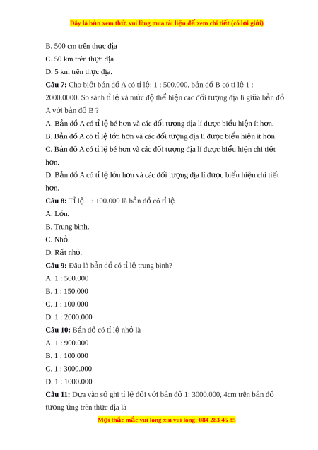 Đây là bản xem th , vu ử i lòng mua tài li u ệ đ xe ể m chi ti t ế (có l i ờ gi i ả ) B. 500 cm trên th c đ ự a ị C. 50 km trên th c đ ự a ị D. 5 km trên th c ự đ a. ị Câu 7: Cho bi t ế b n đ ả ồ A có t l ỉ : ệ 1 : 500.000, b n đ ả B ồ có t l ỉ 1 : ệ