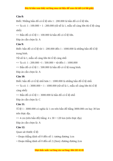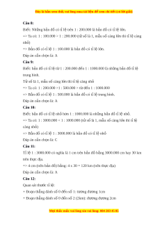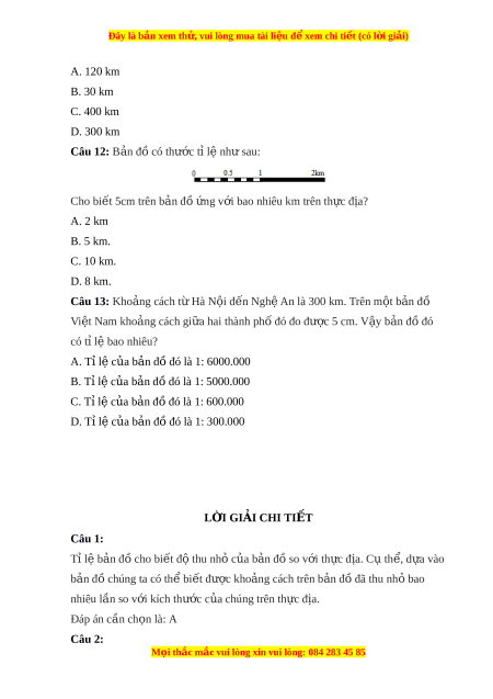 Đây là bản xem th , vu ử i lòng mua tài li u ệ đ xe ể m chi ti t ế (có l i ờ gi i ả ) A. 120 km B. 30 km C. 400 km D. 300 km Câu 12: B n đ ả ồ có thư c ớ t l ỉ nh ệ s ư au: Cho bi t ế 5cm trên b n đ ả ồ ng v ứ i ớ bao nhiêu km trên th c ự đ a? ị A. 2 km B. 5 km. C. 10 km. D. 8 km. Câu 13: Kho ng ả cách t H ừ à N i ộ đ n N ế gh ệ An là 300 km. Trên m t ộ b n ả đ ồ Việt Nam kho ng ả cách gi a ữ hai thành ph đó đo đ ố ư c ợ 5 cm. V y b ậ n ả đ đó ồ có tỉ lệ bao nhiêu? A. Tỉ lệ c a b ủ n ả đồ đó là 1: 6000.000 B. Tỉ lệ c a ủ b n đ ả ồ đó là 1: 5000.000 C. Tỉ lệ c a ủ b n đ ả ồ đó là 1: 600.000 D. Tỉ lệ c a b ủ n ả đồ đó là 1: 300.000 L I Ờ GIẢI CHI TI T Ế Câu 1: Tỉ lệ b n đ ả ồ cho bi t ế đ t ộ hu nhỏ c a b ủ n ả đ s ồ o v i ớ th c đ ự a. C ị t ụ h , d ể a vào ự b n đ ả ồ chúng ta có th bi ể t ế được kho ng ả cách trên b n đ ả đã t ồ hu nh bao ỏ nhiêu lần so v i ớ kích thư c ớ c a chúng t ủ rên th c đ ự a. ị Đáp án cần ch n ọ là: A Câu 2: M i
