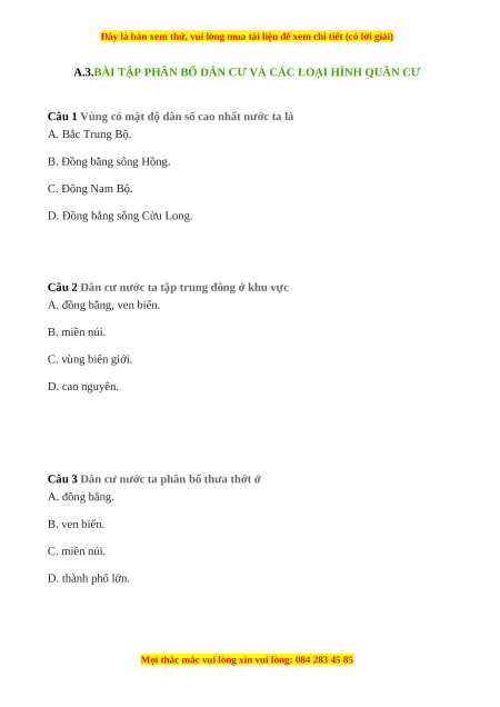 A.3.BÀI TẬP PHÂN BỐ DÂN CƯ VÀ CÁC LOẠI HÌNH QUẦN CƯ