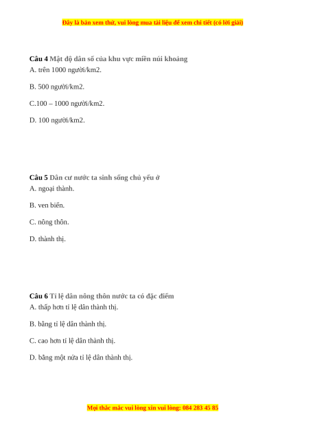 Câu 3 Dân cư nước ta phân bố thưa thớt ở A. đồng bằng. B. ven biển. C. miền núi. D. thành phố lớn.