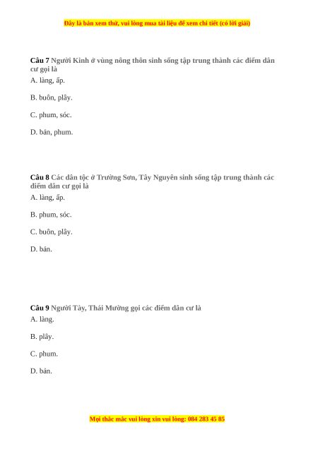 Câu 8 Các dân tộc ở Trường Sơn, Tây Nguyên sinh sống tập trung thành các điểm dân cư gọi là A. làng, ấp. B. phum, sóc. C. buôn, plây. D. bản.