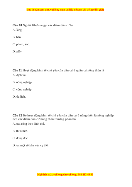 Câu 10 Người Khơ-me gọi các điểm dân cư là A. làng. B. bản. C. phum, sóc. D. plây.