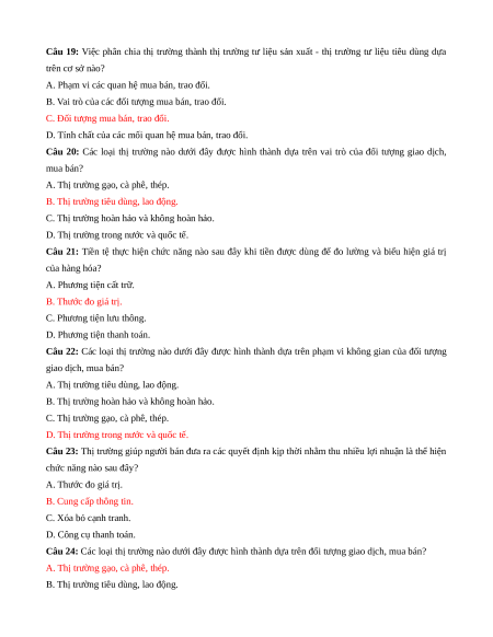 Câu 24: Các loại thị trường nào dưới đây được hình thành dựa trên đối tượng giao dịch, mua bán?