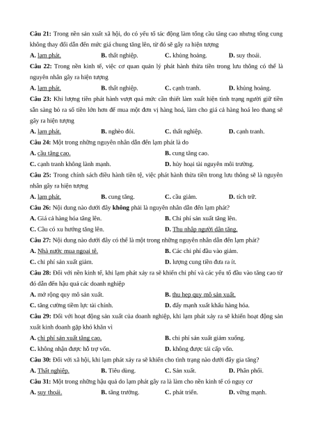 Câu 30: Đối với xã hội, khi lạm phát xảy ra sẽ khiến cho tình trạng nào dưới đây gia tăng? A. Thất nghiệp. B. Tiêu dùng. C. Sản xuất. D. Phân phối.