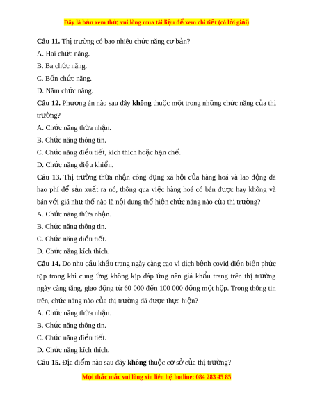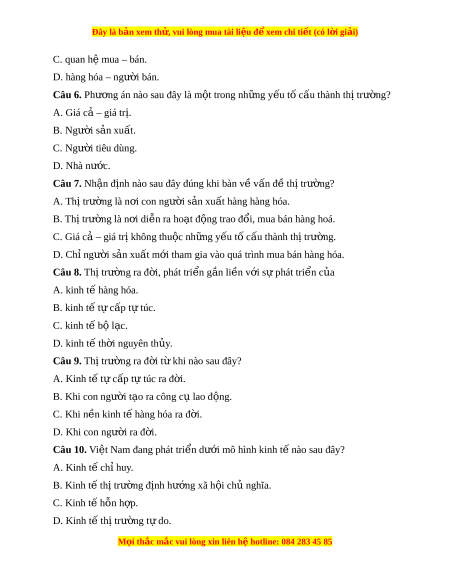 Đây là bản xem th , vu ử i lòng mua tài li u ệ đ xe ể m chi ti t (c ế ó l i ờ gi i ả ) C. quan h m ệ ua – bán. D. hàng hóa – ngư i ờ bán. Câu 6. Phư ng ơ án nào sau đây là m t ộ trong nh ng ữ y u t ế c ố u t ấ hành th t ị rư ng ờ ? A. Giá c – gi ả á tr . ị B. Ngư i ờ s n xu ả t ấ . C. Ngư i ờ tiêu dùng. D. Nhà nư c. ớ Câu 7. Nh n ậ đ nh nào s ị au đây đúng khi bàn v v ề n đ ấ t ề h t ị rư ng? ờ A. Thị trư ng l ờ à n i ơ con ngư i ờ s n ả xu t ấ hàng hàng hóa. B. Th t ị rư ng l ờ à n i ơ di n r ễ a ho t ạ đ ng t ộ rao đ i ổ , mua bán hàng hoá.