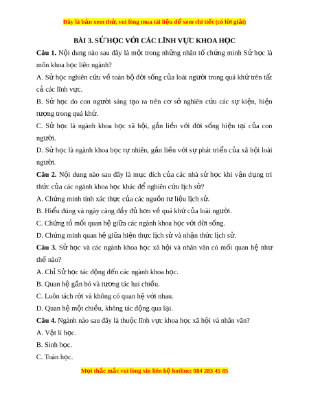 Đây là bản xem th , vu ử i lòng mua tài li u ệ đ xe ể m chi ti t (c ế ó l i ờ gi i ả ) BÀI 3. S H Ử C Ọ V I Ớ CÁC LĨNH V C Ự KHOA H C Ọ Câu 1. N i