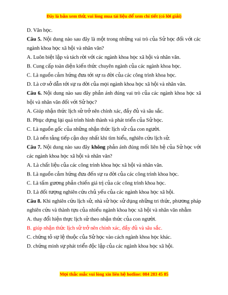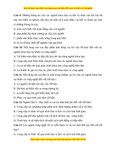 ộ dung nào sau đây là m t ộ trong nh ng ữ vai trò c a ủ S ử h c ọ đ i ố v i ớ các ngành khoa h c xã h ọ i ộ và nhân văn? A. Luôn bi t ệ l p và t ậ ách r i ờ v i ớ các ngành khoa h c ọ xã h i ộ và nhân văn. B. Cung c p t ấ oàn di n ki ệ n t ế h c chuyên ứ ngành c a các ủ ngành khoa h c. ọ C. Là nguồn c m ả h ng đ ứ a t ư i ớ sự ra đ i ờ c a các ủ công trình khoa h c. ọ D. Là c s ơ d ở n t ẫ i ớ sự ra đ i ờ c a m ủ i ọ ngành khoa h c xã h ọ i ộ và nhân văn. Câu 6. N i ộ dung nào sau đây ph n ả ánh đúng vai trò c a ủ các ngành khoa h c ọ xã h i ộ và nhân văn đối v i ớ S h ử c? ọ A. Giúp nh n ậ th c l ứ ch s ị ử tr nên ở chính xác, đ y đ ầ và s ủ âu s c. ắ B. Ph c d ụ ng l ự i