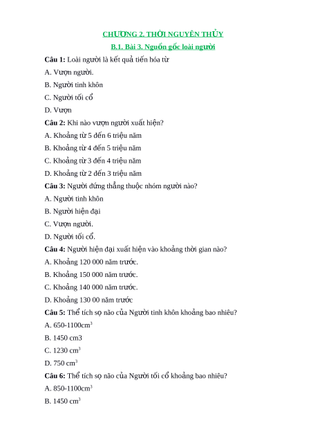 CHƯ N Ơ G 2. TH I Ờ NGUYÊN TH Y Ủ B .1. B ài 3. Ngu n g ồ c ố loài ngư i ờ Câu 1: Loài ngư i ờ là k t ế qu t ả i n hóa t ế ừ A. Vư n ng ợ ư i ờ . B. Ngư i ờ tinh khôn C. Ngư i ờ tối cổ D. Vư n ợ Câu 2: Khi nào vư n ợ ngư i ờ xu t ấ hi n? ệ A. Kho ng t ả 5 đ ừ n ế 6 tri u năm ệ B. Kho ng ả t 4 đ ừ n 5 t ế ri u năm ệ C. Kho ng ả t 3 đ ừ n 4 t ế ri u năm ệ D. Kho ng t ả 2 đ ừ n ế 3 tri u năm ệ Câu 3: Ngư i ờ đ ng t ứ h ng t ẳ hu c ộ nhóm ngư i ờ nào? A. Ngư i ờ tinh khôn B. Ngư i ờ hi n đ ệ i ạ C. Vư n ợ ngư i ờ . D. Ngư i ờ tối cổ. Câu 4: Ngư i ờ hi n đ ệ i ạ xu t ấ hi n vào kho ệ ng ả th i ờ gian nào? A. Kho ng 120 000 năm ả trư c. ớ B. Kho ng ả 150 000 năm trước. C. Kho ng ả 140 000 năm trước. D. Kho ng 130 00 năm ả trư c ớ Câu 5: Th t ể ích sọ não c a N ủ gư i ờ tinh khôn kho ng bao nhi ả êu? A. 650-1100cm3 B. 1450 cm3 C. 1230 cm3 D. 750 cm3 Câu 6: Th t ể ích sọ não c a N ủ gư i ờ t i ố c kho ổ ng ả bao nhiêu? A. 850-1100cm3 B. 1450 cm3 C. 1230 cm3 D. 750 cm3 Câu 7: Các d ng ạ ngư i