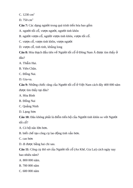 Câu 8: Hóa thạch đ u t ầ iên v N ề gư i ờ t i ố c ổ Đ ở ông Nam Á đư c ợ tìm th y ấ ở đâu? A. Thẩm Hai. B. Viên Chăn. C. Đồng Nai. D. Gia-va. Câu 9: Nh ng ữ chi c r ế ăng c a N ủ gư i ờ tối c ổ ở Vi t