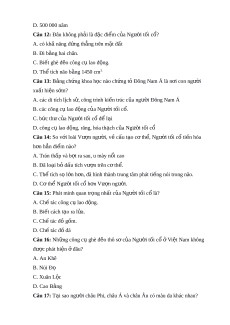 Câu 15: Phát minh quan tr ng nh ọ t ấ c a N ủ gư i ờ t i ố c l ổ à? A. Ch t ế ác công c l ụ ao đ ng. ộ B. Bi t ế cách t o ạ ra l a. ử C. Chế tác đồ gốm. D. Ch t ế ác đ đá ồ Câu 16: Nh ng ữ công c ghè đ ụ o t ẽ hô sơ c a N ủ gư i ờ tối c ổ ở Vi t ệ Nam không đư c phát ợ hi n ệ đâu? ở A. An Khê B. Núi Đọ C. Xuân L c ộ D. Cao B ng ằ Câu 17: T i ạ sao ngư i