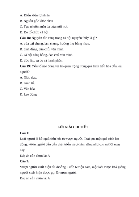Câu 18: Nguyên t c vàng t ắ rong xã h i ộ nguyên th y l ủ à gì? A. c a c ủ i ả chung, làm chung, hư ng ở th b ụ ng nhau. ằ B. bình đ ng, ẳ dân ch , văn m ủ inh. C. xã h i ộ công b ng, dân ch ằ ủ văn minh. D. đ c l ộ p, ậ t do và h ự nh phúc. ạ Câu 19: Y u