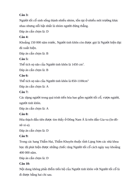 Câu 10: Đâu không ph i ả là đi m ể ti n b ế c ộ a ủ Ngư i ờ tinh khôn so v i ớ Ngư i ờ tối cổ? A. Có b não ộ l n h ớ n. ơ B. bi t ế chế t o công c ạ ụ lao đ ng t ộ inh x o h ả n. ơ C. cao h n ơ D. đi đư c b ợ ng ằ hai chi sau.