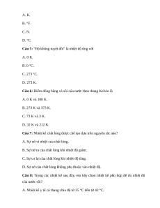 Câu 5: "Độ không tuyệt đối" là nhiệt độ ứng với A. 0 K. B. 0 °C. C. 273 °C. D. 273 K.