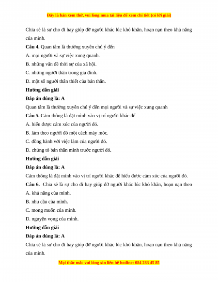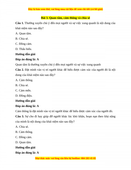 Câu 1. Thường xuyên chú ý đến mọi người và sự việc xung quanh là nội dung của khái niệm nào sau đây? A. Quan tâm. B. Chia sẻ. C. Đồng cảm. D. Thấu hiểu. Hướng dẫn giải Đáp án đúng là: A