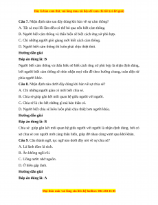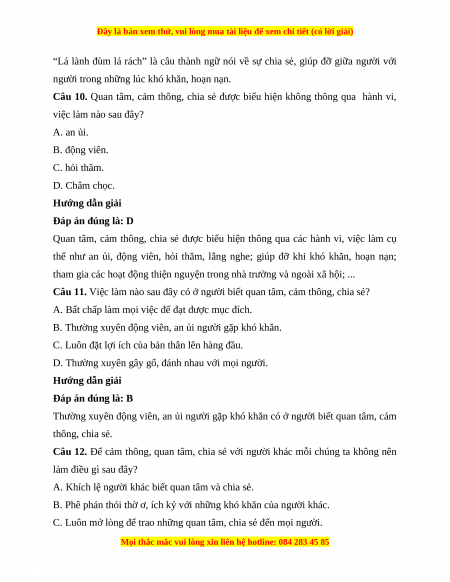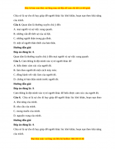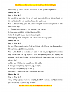 Câu 10. Quan tâm, cảm thông, chia sẻ được biểu hiện không thông qua hành vi, việc làm nào sau đây? A. an ủi. B. động viên. C. hỏi thăm. D. Châm chọc. Hướng dẫn giải Đáp án đúng là: D
