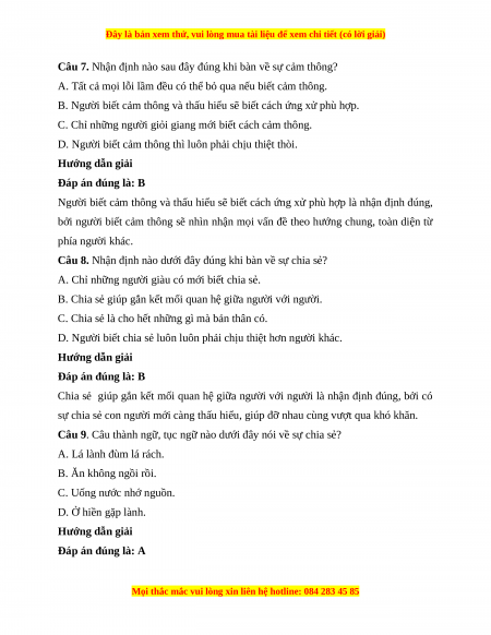 Câu 7. Nhận định nào sau đây đúng khi bàn về sự cảm thông?