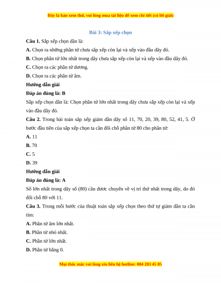 Câu 3. Trong mỗi bước của thuật toán sắp xếp chọn theo thứ tự giảm dần ta cần tìm: