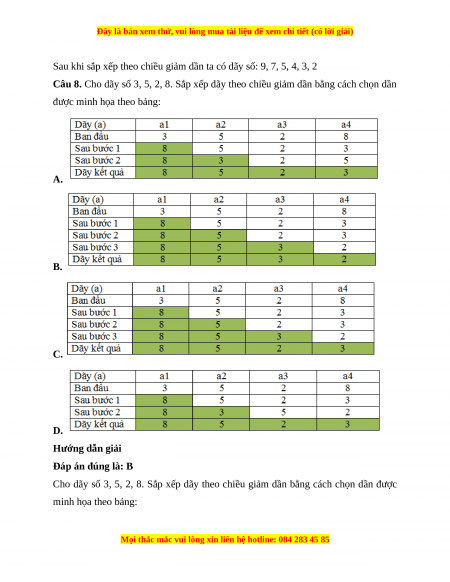 Câu 8. Cho dãy số 3, 5, 2, 8. Sắp xếp dãy theo chiều giảm dần bằng cách chọn dần