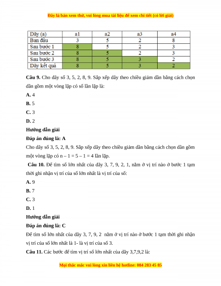 Câu 7. Cho dãy số 2, 5, 4, 9, 3, 7. Sắp xếp dãy số theo thứ tự giảm dần theo cách