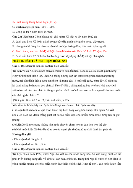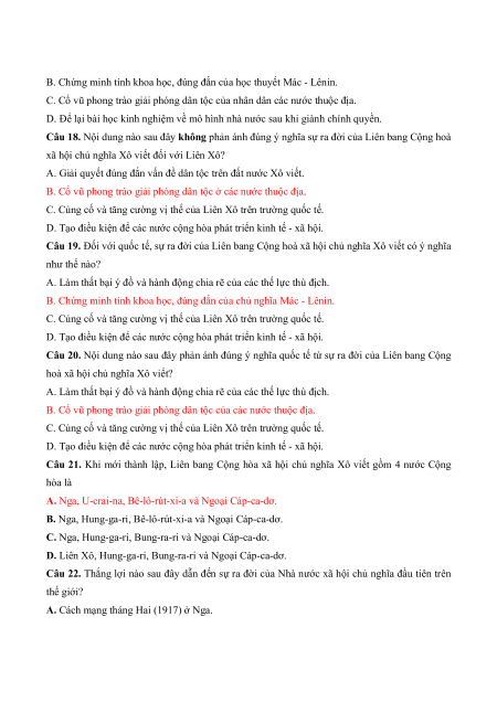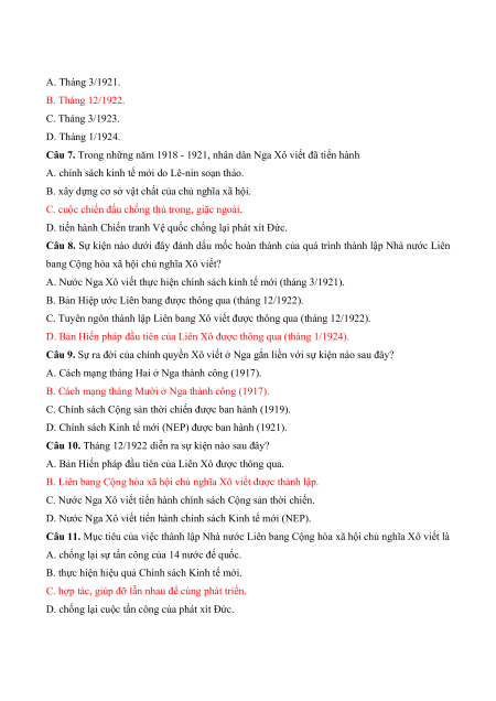 Câu 6. Liên bang Cộng hoà xã hội chủ nghĩa Xô viết được thành lập vào thời gian nào? A. Tháng 3/1921. B. Tháng 12/1922. C. Tháng 3/1923. D. Tháng 1/1924.