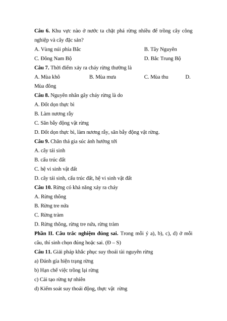 Câu 7. Thời điểm xảy ra cháy rừng thường là A. Mùa khô B. Mùa mưa C. Mùa thu D. Mùa đông