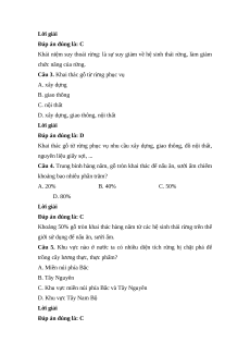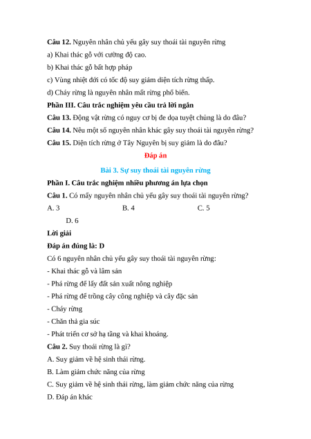 Câu 1. Có mấy nguyên nhân chủ yếu gây suy thoái tài nguyên rừng? A. 3 B. 4 C. 5 D. 6 Lời giải Đáp án đúng là: D