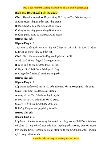 Đây là bản xem th , vu ử i lòng mua tài li u ệ đ xe ể m chi ti t ế (có l i ờ gi i ả ) Bài 3. Trái Đ t ấ . Thuy t ế ki n t ế o m ạ ng ả Câu 1. Theo th t ứ t ự d ừ ư i ớ lên, các t ng đá ầ l ở p v ớ ỏ Trái Đất lần lư t ợ là