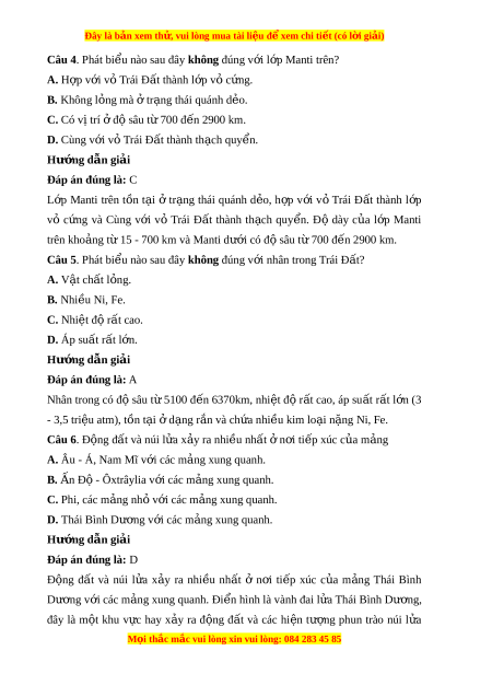 ớ vỏ Trái Đất thành th ch ạ quy n. ể Hư ng ớ d n gi ẫ i ả Đáp án đúng là: A L p M ớ anti dư i ớ có đ s ộ âu từ 700 đ n 2900 km ế , t n t ồ i ạ t ở r ng ạ thái r n ch ắ c. ắ Câu 3. Đ c ặ đi m ể c a l ủ p M ớ anti dư i ớ là A. cùng v i ớ v ỏ Trái Đ t ấ thành th ch ạ quy n. ể B. h p ợ v i ớ v ỏ Trái Đ t ấ thành l p v ớ c ỏ ng. ứ C. có vị trí đ ở ộ sâu t 700 đ ừ n ế 2900 km. D. không l ng m ỏ à t ở r ng t ạ hái quánh dẻo. Hư ng ớ d n gi ẫ i ả Đáp án đúng là: C L p ớ Manti trên t n ồ t i ạ ở tr ng ạ thái quánh d o, ẻ h p ợ v i ớ v T ỏ rái Đ t ấ thành l p ớ vỏ c ng ứ và Cùng v i ớ vỏ Trái Đ t ấ thành th ch ạ quy n. ể Độ dày c a ủ l p ớ Manti trên kho ng