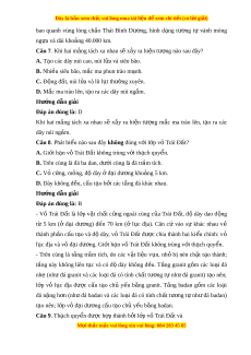 au đây không đúng v i ớ nhân trong Trái Đất? A. V t ậ chất l ng. ỏ B. Nhi u N ề i, Fe. C. Nhi t ệ đ r ộ t ấ cao. D. Áp suất r t ấ l n. ớ Hư ng d ớ ẫn gi i ả Đáp án đúng là: A Nhân trong có đ s ộ âu t 5100 ừ đ n ế 6370km, nhi t ệ đ r ộ t ấ cao, áp su t ấ r t ấ l n ớ (3 - 3,5 tri u at ệ m), t n t ồ i ạ d ở ng r ạ n và ắ ch a nhi ứ u ki ề m lo i ạ n ng ặ Ni, Fe. Câu 6. Đ ng ộ đ t ấ và núi l a ử x y r ả a nhi u nh ề t ấ n ở i ơ ti p xúc c ế a ủ m ng ả