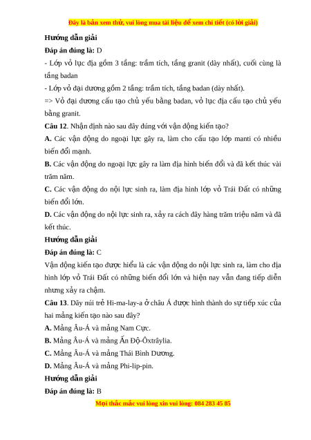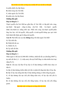 au đây không đúng v i ớ nhân ngoài Trái Đ t ấ ? A. V t ậ chất r n. ắ B. Nhi t ệ đ r ộ ất cao. C. Nhi u N ề i, Fe. D. Áp suất r t ấ l n. ớ Hư ng d ớ ẫn gi i ả Đáp án đúng là: A Nhân ngoài có đ ộ sâu t ừ 2900 đ n ế 5100km, nhi t ệ đ ộ r t ấ cao (kho ng ả 50000C), áp su t ấ r t ấ l n ớ (1,3 - 3,1 tri u ệ atm), t n ồ t i ạ ở th ể l ng ỏ và ch a ứ nhi u ề kim lo i ạ n ng ặ Ni, Fe. Câu 11. Cấu t o ạ c a ủ l p ớ vỏ l c ụ đ a ị và vỏ đ i ạ dư ng ơ có đi m ể khác nhau cơ b n ả là A. l p v ớ ỏ đ i ạ dư ng ơ chi m ế di n t ệ ích l n ớ và phân b r ố ng h ộ n ơ l p v ớ l ỏ c đ ụ a. ị B. l p v ớ l ỏ c đ ụ ịa m ng ỏ h n l ơ p v ớ đ ỏ i ạ dư ng nh ơ ng có t ư hêm t ng đá gr ầ anit. C. vỏ đ i ạ dư ng ơ c u ấ t o ạ chủ y u ế b ng ằ tr m ầ tích, vỏ l c ụ đ a ị chủ y u ế là badan. D. vỏ đ i ạ dư ng ơ c u ấ t o ạ chủ y u ế b ng ằ badan, vỏ l c ụ đ a ị chủ y u ế b ng ằ granit. M i ọ thắc m c
