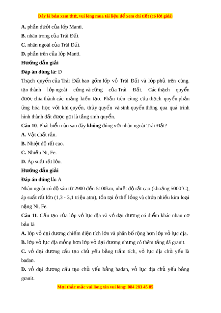 Đây là bản xem th , vu ử i lòng mua tài li u ệ đ xe ể m chi ti t (c ế ó l i ờ gi i ả ) A. phần dư i ớ c a ủ l p M ớ anti. B. nhân trong c a ủ Trái Đ t ấ . C. nhân ngoài c a ủ Trái Đất. D. phần trên c a l ủ p M ớ anti. Hư ng d ớ ẫn gi i ả Đáp án đúng là: D Th ch ạ quy n ể c a ủ Trái Đ t ấ bao gồm l p ớ vỏ Trái Đ t ấ và l p ớ phủ trên cùng, t o ạ thành l p ớ ngoài c ng ứ và c ng ứ c a ủ Trái Đ t ấ . Các th ch ạ quy n ể đư c ợ chia thành các m ng ả ki n ế t o. ạ Ph n ầ trên cùng c a ủ th ch ạ quy n ể ph n ả ng ứ hóa h c ọ v i ớ khí quy n ể , th y ủ quy n ể và sinh quy n ể thông qua quá trình hình thành đất đư c ợ g i ọ là tầng sinh quy n ể .