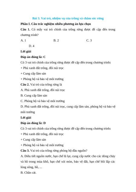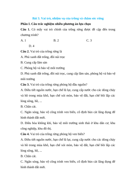 Câu 1. Có mấy vai trò chính của trồng rừng được đề cập đến trong chương trình? A. 1 B. 2 C. 3 D. 4