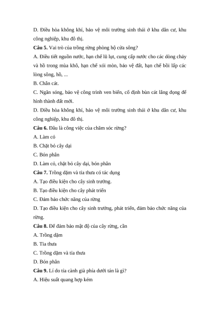 Câu 8. Để đảm bảo mật độ của cây rừng, cần A. Trồng dặm B. Tỉa thưa