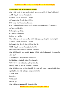 ọ quốc gia trên thế gi i ớ là công nghi p ệ A. s n ả xu t ấ hàng tiêu dùng. B. khai thác d u khí ầ . C. điện t - ử tin h c. ọ D. khai thác than. Câu 13. Ở nư c ớ ta, vùng than l n ớ nh t ấ hi n ệ đang khai thác thu c ộ t nh ỉ nào dư i ớ đây? A. Hòa Bình. B. Qu ng ả Ninh. C. Cà Mau. D. L ng S ạ n. ơ Câu 14. Nguyên li u ệ ch ủ y u ế c a ủ ngành công nghi p ệ th c ự ph m ẩ là s n ả ph m ẩ c a ngành ủ A. khoáng s n, ả chăn nuôi, h i ả s n. ả B. th y s ủ n, l ả âm s n, t ả rồng tr t ọ . C. trồng tr t ọ , chăn nuôi, th y s ủ n. ả D. lâm s n, ả trồng tr t ọ , th y s ủ n. ả