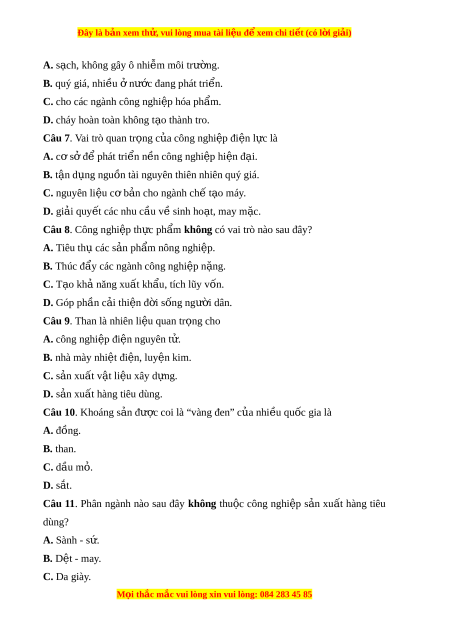 Đây là bản xem th , vu ử i lòng mua tài li u ệ đ xe ể m chi ti t ế (có l i ờ gi i ả ) D. Dư c ph ợ ẩm. Câu 12. Ngành đư c ợ coi là thư c ớ đo trình đ ộ phát tri n ể kinh t ế - kĩ thu t ậ c a ủ m i