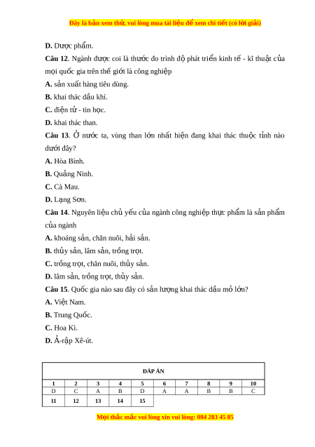 Câu 15. Quốc gia nào sau đây có s n ả lư ng khai ợ thác d u m ầ l ỏ n? ớ A. Việt Nam. B. Trung Quốc. C. Hoa Kì. D. - Ả r p ậ Xê-út. ĐÁP ÁN 1 2 3 4 5 6 7 8 9 10 D C A B D A A B B C 11 12 13 14 15 M i