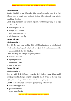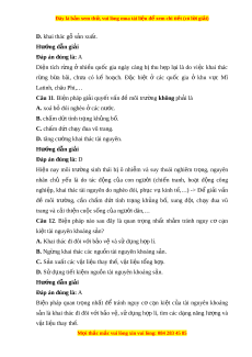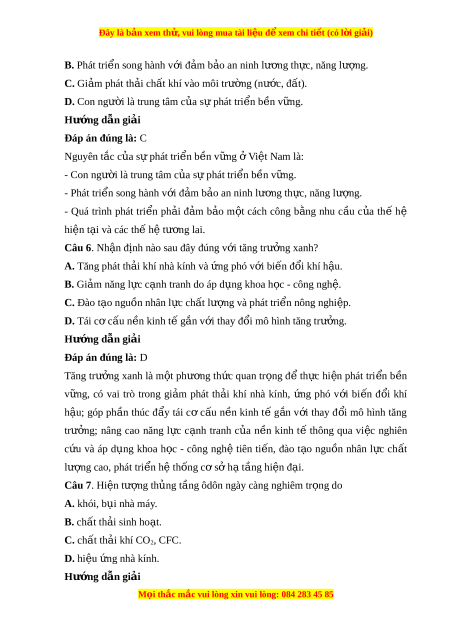 Đây là bản xem th , vu ử i lòng mua tài li u ệ đ xe ể m chi ti t ế (có l i ờ gi i ả ) B. Phát tri n s ể ong hành v i ớ đ m ả b o ả an ninh lư ng t ơ h c, năng l ự ư ng. ợ C. Gi m ả phát th i ả ch t ấ khí vào môi trư ng ( ờ nư c, đ ớ t ấ ). D. Con ngư i ờ là trung tâm c a ủ s phát ự tri n b ể n v ề ng. ữ Hư ng ớ d n gi ẫ i ả Đáp án đúng là: C Nguyên t c ắ c a s ủ ự phát tri n b ể n ề v ng ữ ở Vi t ệ Nam là: - Con ngư i ờ là trung tâm c a s ủ ự phát tri n ể b n v ề ng. ữ - Phát tri n s ể ong hành v i ớ đ m ả b o ả an ninh lư ng t ơ h c, năng l ự ư ng. ợ - Quá trình phát tri n ể ph i ả đ m ả b o ả m t ộ cách công b ng ằ nhu c u ầ c a ủ th ế hệ hiện t i ạ và các thế h t ệ ư ng ơ lai. Câu 6. Nh n đ ậ